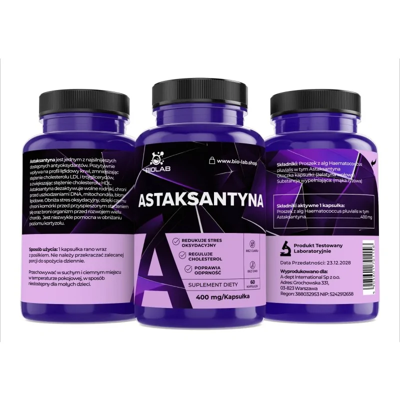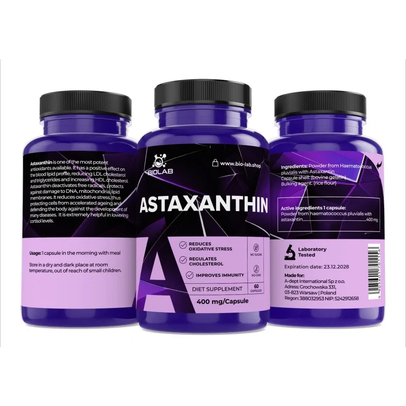 We gebruiken alleen natuurlijke astaxanthine geëxtraheerd uit de microalg Haematococcus pluvialis, die de hoogste biologische activiteit heeft en veilig is voor langdurig gebruik. Dankzij strenge extractienormen leveren we een product met volledige zuiverheid. Door te kiezen voor Biolab, zet je in op een bewezen stabiele ondersteuning, vrij van verontreinigingen en gericht op een echte bescherming van je cellen. Vergeet niet om je arts of apotheker te raadplegen voordat je met een supplement begint.